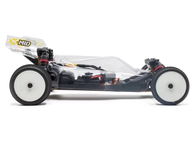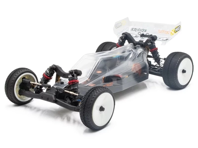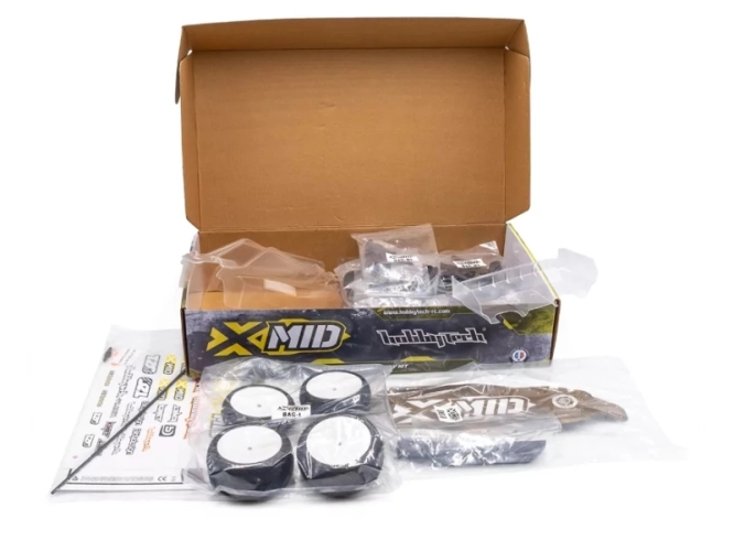 Model X-mid buggy kit se dodává s čirou karoserií a závodními pneumatikami značky TZO.