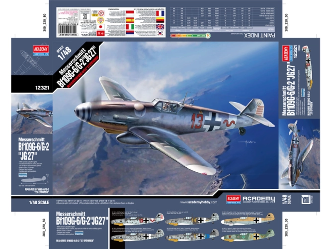 Academy plastikový model letadla Messerschmitt Bf109G-6/G-2 JG 27 v měřítku 1:48 ke slepení.