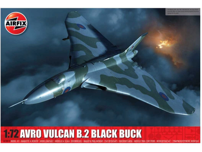 Plastikový model Airfix A12013 - letadlo Avro Vulcan B.2 Black Buck v měřítku 1:72 ke slepení. Stavebnice obsahuje 271 dílků, obtížnost 3.