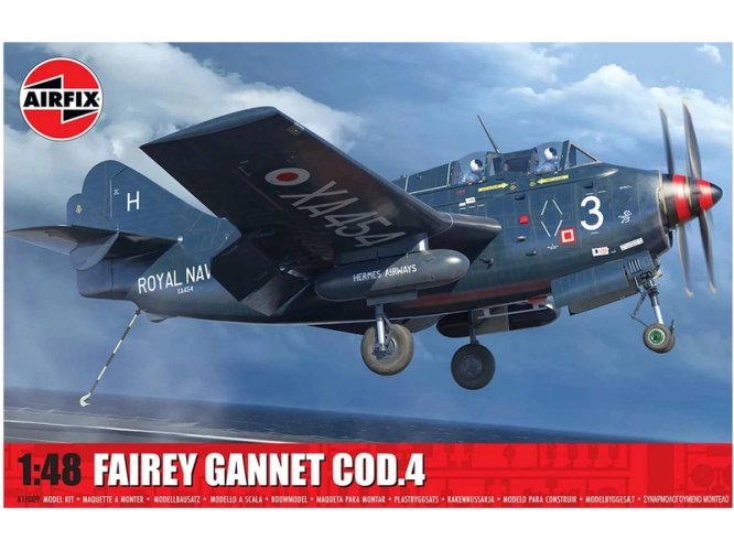 Plastikový model Airfix A11009 - letadlo Fairey Gannet COD.4 v měřítku 1:48 ke slepení. Stavebnice obsahuje 245 dílků, rozpětí křídel 344 mm, obtížnost 4.