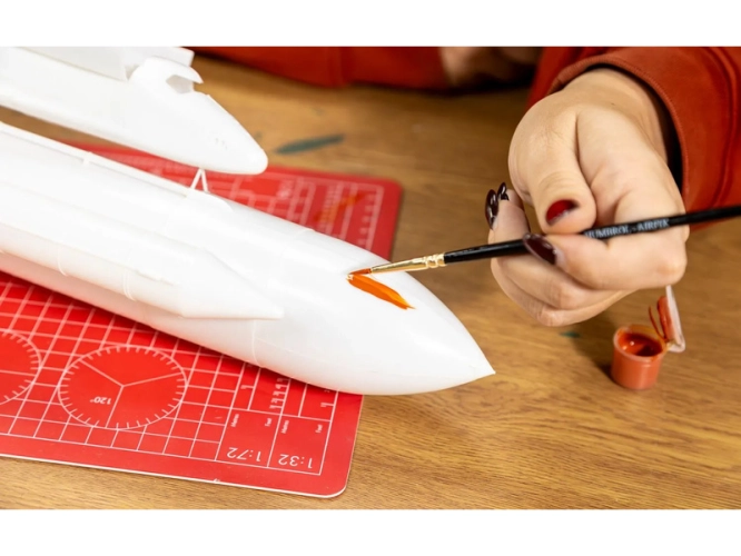 Plastikový model ke slepení, barvy, štětce, lepidla, návod, obtisky.