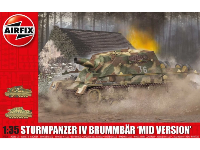 Plastikový model Airfix A1376 – tank Sturmpanzer IV Brummbar (Mid Version) v měřítku 1:35 ke slepení. Délka 170 mm, stavební obtížnost 3.