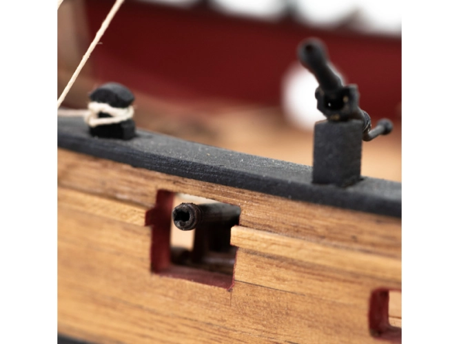 Stavebnice statické makety historické lodi AMATI Adventure pirátská loď z roku 1760 v měřítku 1:60, kit. Pirátská loď známých pirátů Edwarda Anglického z afrických vod a John Calico Rackam, který děsil Indii s pirátskou nevěstou Annou Bonny Westovou. Dřevěné díly, kýl a obšívka jsou řezány laserem, obsaženy jsou plachty, lanoví, stožáry, kování, doplňky, podrobný obrázkový návod ke stavbě s německým popisem a plány.