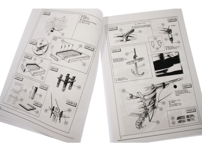 Set obsahuje kompletní sadu výkresové dokumentace modelu v měřítku 1:1 s obrázky jednotlivých detailů. Na výkrese jsou v měřítku nakresleny montážní sestavy, jejich kompletace a to včetně stěžňů a ráhen a způsob vázání lanoví. Vícejazyčný postup stavby rámcově upravuje logické sestavení jednotlivých komponentů.