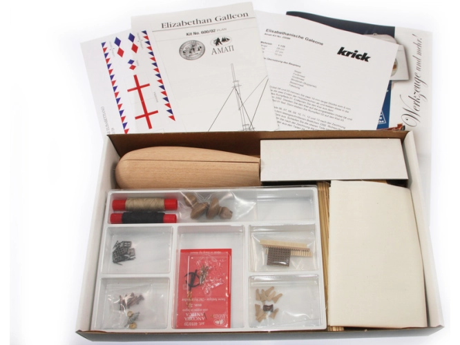 Po otevření víka krabice naleznete dřevěné díly modelu, drobné součásti uzavřené v plastovém průhledném blistru a sadu výkresů.