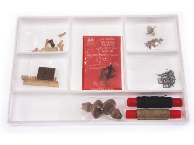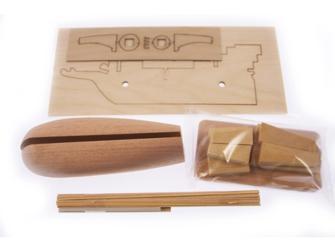 Balení obsahuje hotový polotovar trupu, překližkové díly, dřevěné lišty, blistr s drobnými díly, sadu výkresů a návod český, anglický a italský.