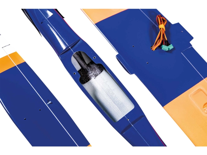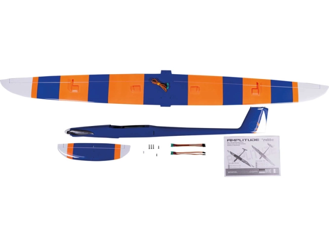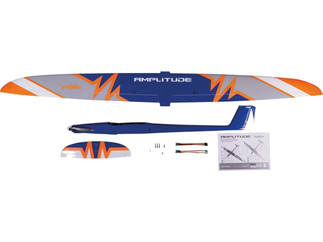 V balení je RC model Amplitude 1.8m s nainstalovanými komponenty: střídavý motor Robbe X36-800, 5x servo Robbe FS-155 BB MG HV, prodlužovací kabely s konektory MPX-JR, kužel 38mm, sklopná vrtule 12x8“ CAM. Manuál EN, DE, FR.