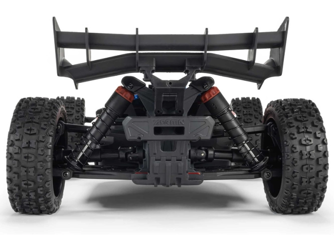 Osvědčená odolná platforma ARRMA® 4X4, vám umožní jezdit vysokou rychlostí téměř v jakémkoli prostředí - v terénu, na šotolině a trávě, na parkovištích i po zpevněných a asfaltových površích. Odolnost šasí vychází ze silného kompozitového podvozku, s prodlouženou výškou chráničů nečistot. Použité kovové převody jsou dostatečně odolné pro střídavý pohon. Výkon je distribuován na jednotlivá kola pomocí přední a zadního diferenciálu. Maximální trakci zajišťují osvědčené úzké pneumatiky dBoots. Přítlak ve vyšší rychlostech zvyšuje zadní křídlo. Vysílač Spektrum SLT poskytuje bezpečný provoz bez výpadků, pro bezstarostnou jízdu jsou na modelu použity voděodolné* komponenty - regulátor s přijímače Spektrum 2-v-1 85A a servo řízení Spektrum S662 s vysokým točivým momentem a kovovými převody.