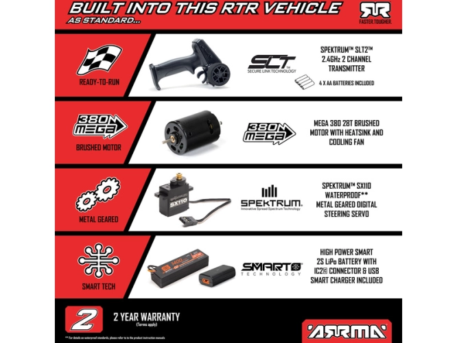 Auto je pro náročnou jízdu skvěle připraveno, obsahuje zesílené kompozitní šasi s autenticky zvýšenými bočnicemi, nezávislé zavěšení, olejové tlumiče a náhon 4WD. Robustní kovové převody diferenciálů přenáší výkon ze stejnosměrného motoru MEGA 380 přes uzavřené hnací ústrojí až na velká kola a pneumatiky dBoots Chevron MT. Dokonce i servo řízení Spektrum™ SX110 má kovové převody a stejně jako přijímač/regulátor Spektrum SLT™ 2-v-1 25A, vybavený konektorem IC2®, je voděodolné* pro jízdu v mokrém prostředí. Integrovaný chladič a ventilátor udržuje nízkou teplotu motoru pro dlouhou životnost a špičkový výkon. S náhradními díly jsou k modelu k dispozici také volitelné tuningové součásti pro vylepšení modelu.