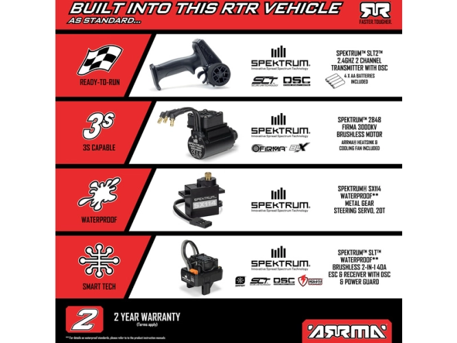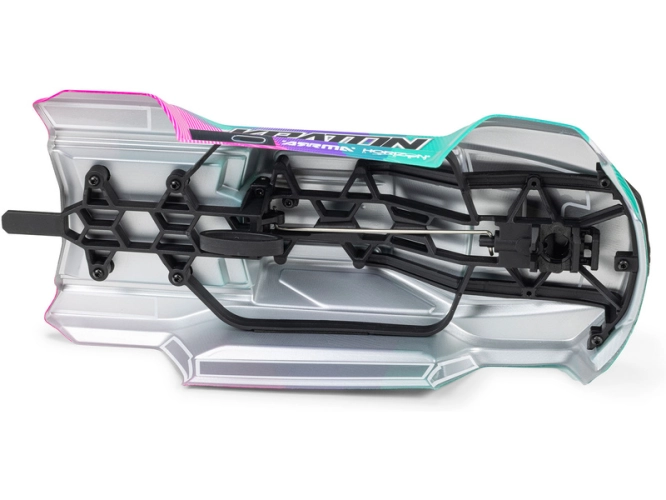 Celá konstrukce je podřízena výkonu a odolnosti - převody diferenciálů jsou kovové stejně jako poloosy, olejové tlumiče obsahují hliníková těla, v celém hnacím ústrojí jsou použita kuličková ložiska, na podvozku je hliníková barevně eloxovaná výztuha a robustní nárazníky chrání při nárazu. Instalována je kvalitní elektronika Spektrum - střídavý motor, řídicí jednotka a servo s kovovými převody. Kromě výborných jízdních vlastností vás model také ohromí designovou karoserií obsahující bezsponkové uchycení pro snadnou montáž a demontáž při výměně akumulátoru.