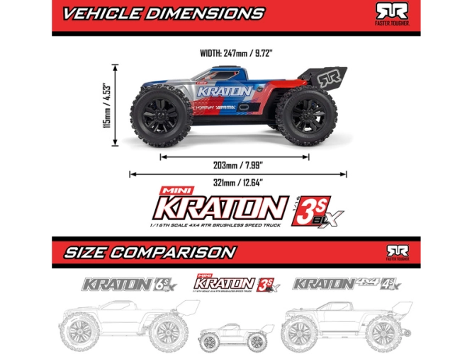 RC model Arrma Mini Kraton 3S je zkonstruován jako ryzí Basher, tedy model hlavně pro maximální zábavu při volné jízdě v jakémkoliv prostředí. Pro tuto jízdu je skvěle připraven - má odolné šasi, náhon 4x4, nezávislé zavěšení, 3 diferenciály a střídavý motor s ohromujícím výkonem. Můžete s ním jezdit na nižší trávě v parku, užít si divokou jízdu v terénu s odlétající šotolinou, nebo třeba skákat na skokáncích. Díky technologii Powerguard umožňuje model všestranné použití pro začátečníky i zkušené jezdce, od pomalejší, ale zato delší jízdy (30 km/h, 30 min) až po neskutečnou rychlost přes 80 km/h. S platformou Mini, s menšími kompaktními rozměry, si navíc můžete model vzít snadno s sebou do batohu a jezdit tak na různých místech. Vše potřebné je v balení, včetně akumulátoru 3S LiPo a USB-C nabíječe.