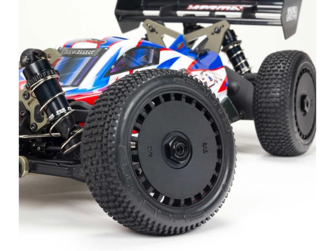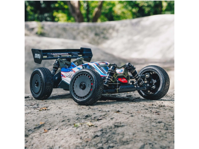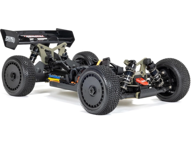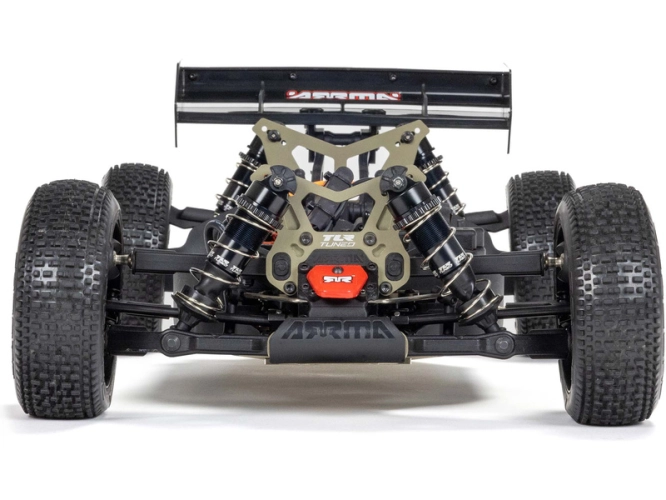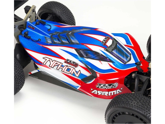 Buggy ARRMA TLR Tuned TYPHON 4WD má široké možnosti ladění podvozku pro závodní použití. S výkonným střídavým motorem a pohonem 4S - 6S LiPo, model ihned vystřelí na trať. Na baterii 4S můžete jezdit trénink, ale teprve s výkonem 6S LiPo bude model předvádět kaskadérské kousky, dlouhé skoky a ostrou jízdu na vaší oblíbené off-road dráze. Model je vybaven speciálními hliníkovými díly TLR Tuned 7075-T6: deskou podvozku, hřebenem řízení, nastavitelnými horními a spodními závěsy odpružení, těly tlumičů a věžemi předních a zadních tlumičů. Všechny tyto díly jsou opatřeny laserem vyleptaným logem TLR Tuned. Olejem plněné nastavitelné tlumiče mají opracované písty, přesné vedení a exkluzivní těsnící X-kroužky. Tlumiče jsou k věžím připevněny pomocí vysokopevnostních držáků Extreme Bash (EXB).