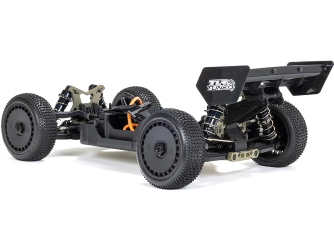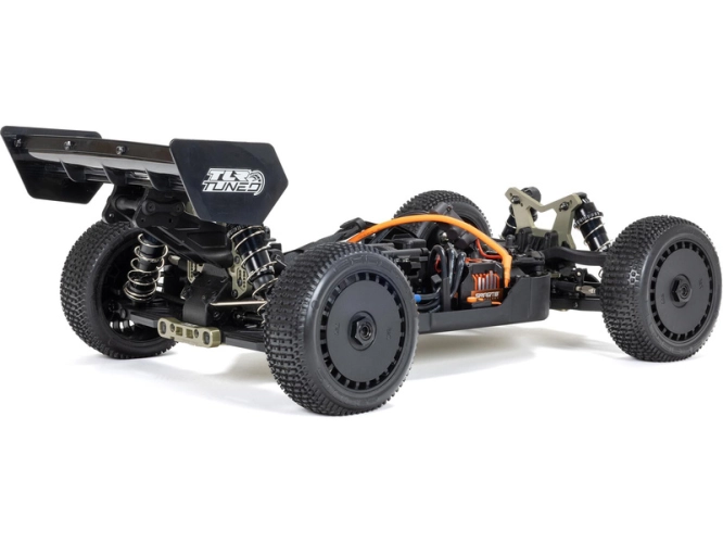 Buggy TLR Tuned TYPHON 4WD je vybavena odolným hnacím ústrojím, které vydrží extrémní jízdu, s celokovovými převody diferenciálu, převodovky a odolnými ocelovými hnacími hřídelemi. Na extra pevných nábojích kol jsou lehká kola s nízkým valivým odporem a pneumatikami EXABYTE se závodní směsí pro více typů terénu. Laditelné zadní křídlo Race Spec účinně tlačí model k zemi, což přispívá k jistému a citlivému ovládání při vysokých rychlostech. Nutná údržba je omezena na minimum, díky efektivní konstrukci. Hliníkový posuvný držák vám umožní rychlý a bezproblémový přístup k motoru Spektrum Firma 4074 2050Kv, další komponenty jsou modulárně rozmístěny. TLR Tuned TYPHON 4WD Race Buggy RTR v měřítku 1:8 je vybavena pevnou karoserií s exkluzivním zbarvením Race Spec. Jedná se o dokonalou RC buggy pro středně pokročilé závodní jezdce.