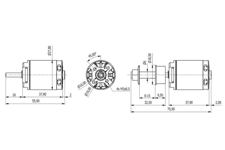 Střídavý elektromotor s rotačním pláštěm nové generace. Hřídel 4 mm.
