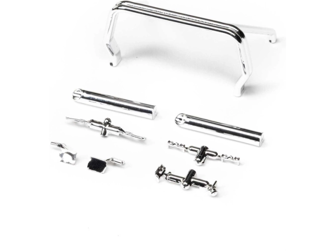 Náhradní díl pro RC model auta Axial SCX30 K10: maketové doplňky karosérie. Chromované díly - zrcátka, kliky dveří, víčko nádrže, rámeček, znak C/10, rám korby.