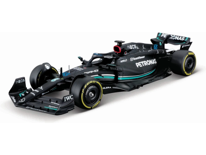 Kovový model Bburago Mercedes-AMG F1 W14 E Performance nejen pro sběratele, v měřítku 1:24. Detailní provedení, přívětivá cena, pilot #63 Russell, približná délka 19cm.