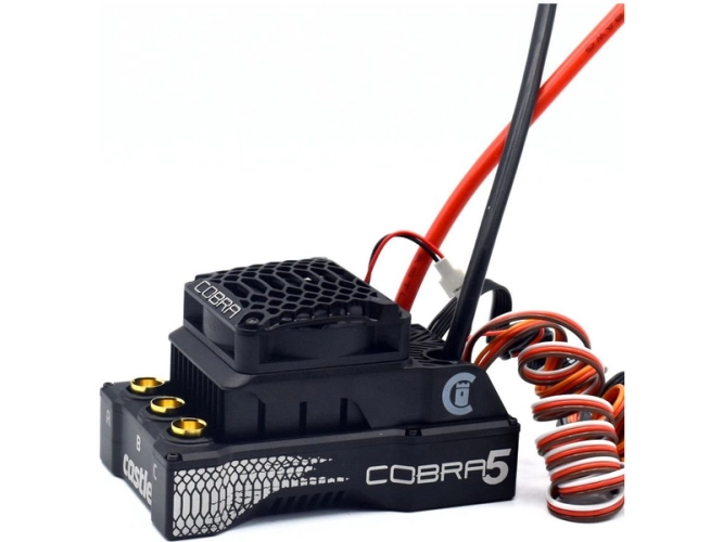 Extra výkonný regulátor otáček Castle Cobra 5, pro RC modely aut v měřítku 1:5 a 1:7 do hmotnosti 19 kg (není určeno pro vysokorychlostní modely typu Drag Race). Napájení 3-8S LiPo, nastavitelný BEC 5-8.5V (max. zatížení 20A). Regulátor je od základu nově navržen a skloubí v sobě špičkovou elektroniku s řadou softwarových vylepšení. Revoluční technologie CRYO-DRIVE zvyšuje účinnost a snižuje teplotu elektroniky. Novou éru přesnosti a výkon zajišťuje dvoujádrový 32bitový microcontroller. K regulátoru lze připojit střídavý motor i střídavý senzorový motor.