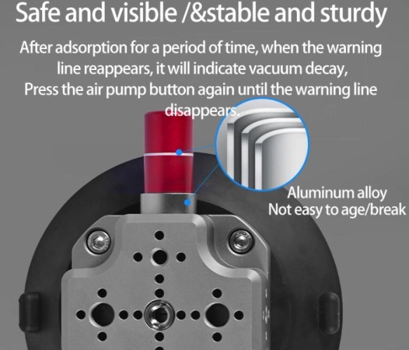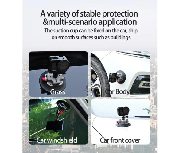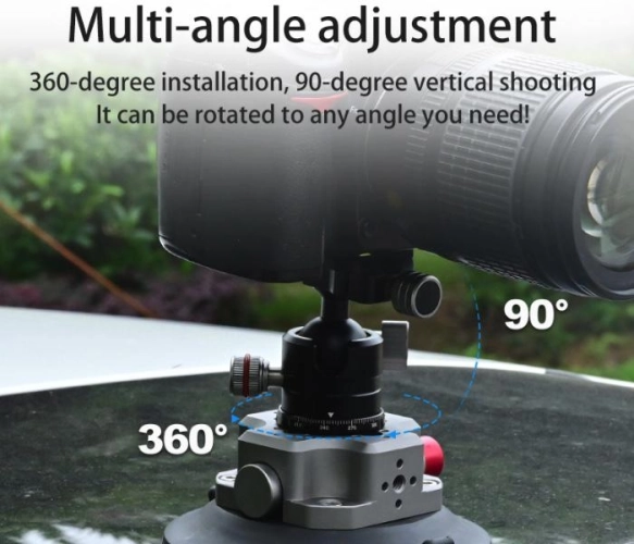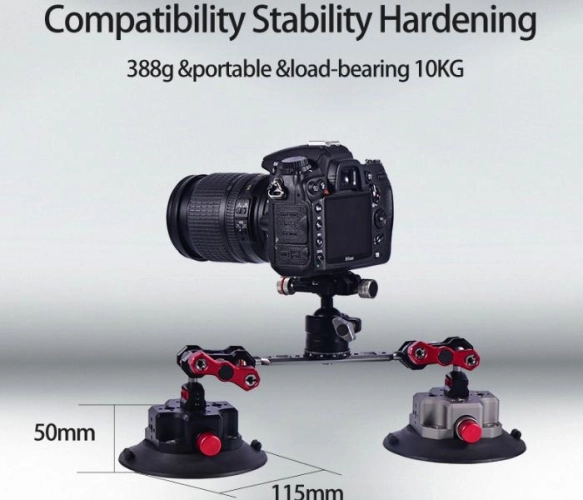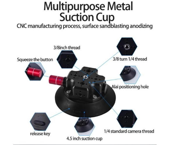 Titanový CNC rychloupínací držák s přísavkou (4,5") je určen pro DSLR, akční kamery i smartphony. Přísavka o rozměrech 115 × 50 mm unese až 1000 g a váží 388 g. Nabízí závity 1/4" a 3/8", Alai poziční otvory a redukci z 3/8" na 1/4". Hliníkové tlačítko zajišťuje pevné a bezpečné upevnění. Ideální pro profesionální natáčení z vozidla i v náročných podmínkách.