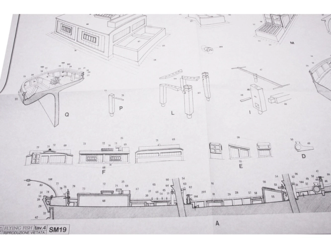 Stavebnice neplovoucího modelu COREL Flying Fish v měřítku 1:50 z roku 1860. Stavitelem lodi byl Jeremiah Burnham, šlo o rybářskou loď, která byla díky elegantnímu štíhlému trupu a velkému plachtoví, jednou z nejrychlejších dvoustěžňových lodí v rybářské flotile v Gloucesteru. V balení jsou dřevěné díly, lišty a množství kování, lanoví, plachty, plány atd.