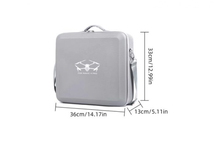 Šedé pouzdro přes rameno pro DJI Mavic 4 Pro je vyrobeno z odolného PU materiálu a EVA pěny pro maximální ochranu dronu a příslušenství. Váží 1050 gramů a má rozměry 36 x 33 x 13 cm. Součástí je ramenní popruh pro pohodlné přenášení. Pouzdro je kompatibilní s ovladači DJI RC 2 a DJI RC Pro 2, a nabízí praktické uspořádání pro bezpečné a přehledné uložení vybavení doma i na cestách.