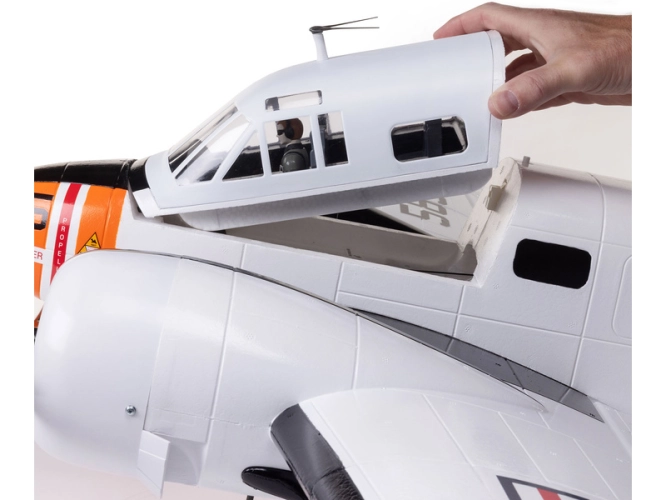 Lehký a odolný drak z kompozitního EPO materiálu je nabarven v dobře viditelné bílé barvě s oranžovými detaily, jedná se o originální vojenské zbarvení letounu amerického námořnictva, které nejprve vstoupilo do služby jako navigační cvičný letoun, poté prošlo generální opravou a v 50. letech 20. století bylo překonfigurováno na cvičné fotoprůzkumné letadlo. Opravdu velmi autentické zpracování je kromě původních proporcí také doplněno o tvarované linie panelů pláště, výfuky motorů, antény a průhlednou kabinu s figurkou pilota. Unikátní třídílná konstrukce křídla usnadňuje skladování, přepravu a přípravu modelu před letem, středová část obsahuje hlavní podvozek, konce křídel se jednoduše instalují a díky handsfree konstrukci se konektory sami připojí při nasazení křídla. Pro finální montáž není nutné žádné lepidlo, postačí běžné nářadí. Beechcraft D18/RC-45J 1.5m můžete mít připravený k letu za kratší dobu než jakékoliv jiné letadlo tohoto typu.