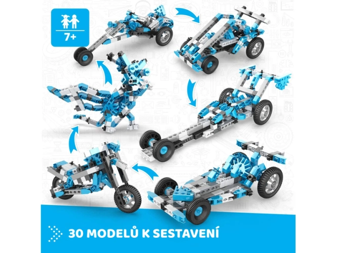 Engino Creative Engineering 30 modelů Master je stavebnice pro děti od 7 let, která obsahuje 210 dílů a sestavíte si z nich 30 úžasných hraček jako vesmírnou raketu, lunární vozík, zimní skútr, formuli, motorku a mnoho dalších.