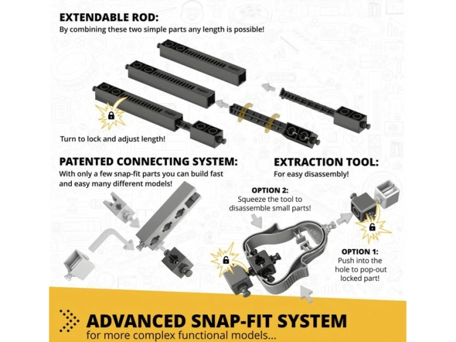 Stem Mechanics vám umožní zjistit, jak kola a nápravy pracují a na co se používají. Zjistěte, jak lze nakloněnou rovinu použít ke zvedání těžkých předmětů a jak se jiná nakloněná rovina, klín, používá v každodenních situacích. Postavte si 14 funkčních modelů, jako je odpalovací plošina, dveře s kličkou, studna, letištní schodiště, experimentální rampa a štípací klín. Jednoduché návody na sestavení všech modelů naleznete buď online, nebo v přiložené brožuře. Brožura poskytuje podrobná vysvětlení různých použitých vědeckých principů a zahrnuje inovativní experimentální aktivity pro praktické učení. K dispozici je také sekce Kvíz, ve které můžete otestovat své nově nabyté znalosti!