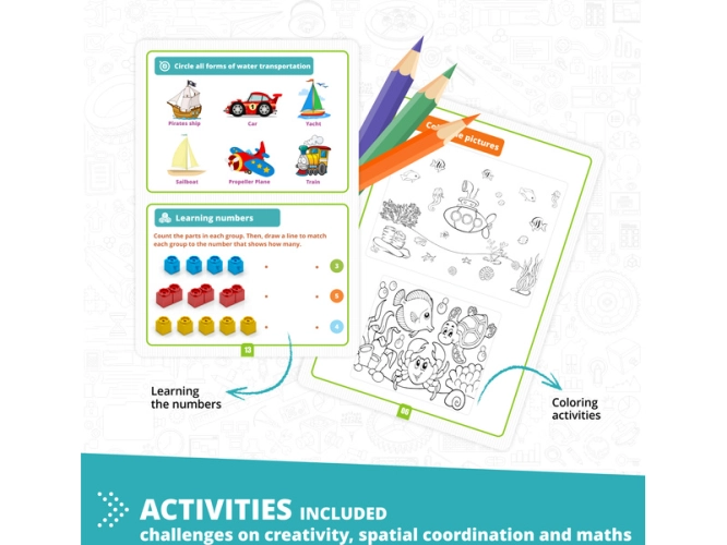 Ponořte své dítě do kreativních aktivit, jako je vybarvování, spojování teček a obkreslování písmen. Tato cvičení podporují kognitivní rozvoj tím, že učí tvary, barvy a základní matematické pojmy. Dobrodružství navíc pokračuje s naší bezplatnou aplikací rozšířené reality (AR), která oživuje mořský svět interaktivním a zábavným způsobem.