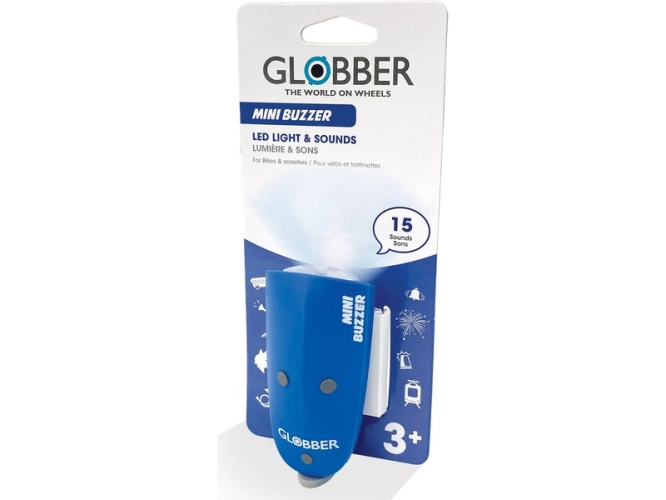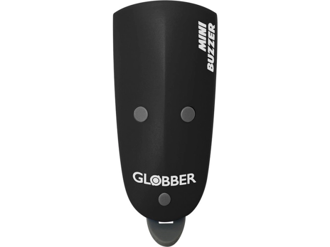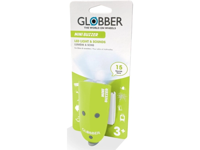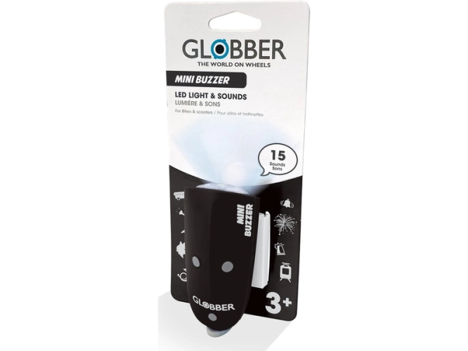 Globber - Mini Buzzer LED bílé světlo se zvonkem - na řídítka kol a koloběžek. K dispozici je 15 zvuků klaksonu včetně zvířecích, dopravních a magických. Světlo má tři režimy svícení - trvale zapnuté, blikání, stroboskop. Silikonový řemínek pro uchycení.