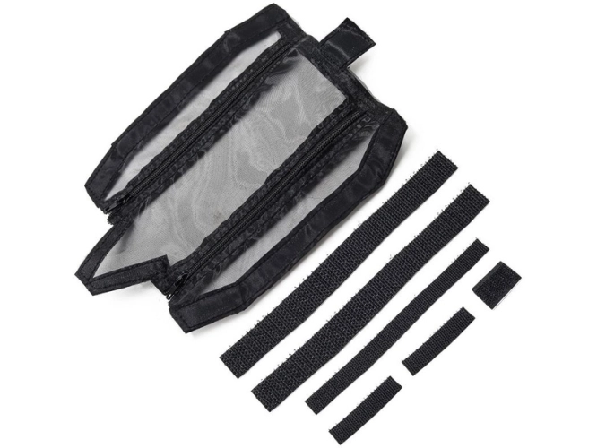 Nasaďte H-Speed protiprachový kryt seshora na podvozek a přehněte lemy na bok nebo pod šasí. Srovnejte a upravte polohu krytu a aplikujte přiloženou oboustrannou pásku suchého zipu přilepením na šasí. Pomocí zdrhovadla na obou stranách můžete protiprachový kryt odejmout.