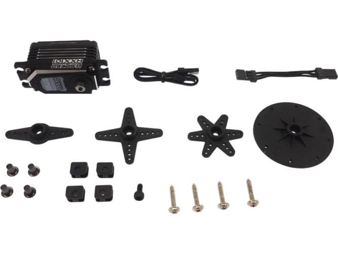 Balení obsahuje servo HXX101, 2x kabel serva (50 mm a 150 mm), 4x páka serva (dvoustranná D - 39mm, čtyřstranná D - 39 mm, šestistranná D - 33 mm, kruhová 45 mm), šroub páky, 4x silentblok s kovovu vložkou, 4x šroub pro uchycení serva.