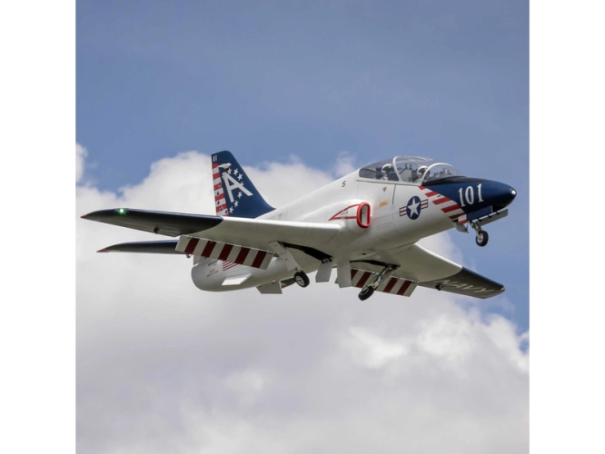 RC model Hangar 9 Hawk/T-45 je sportovní polomaketa proudové cvičné stíhačky amerického námořnictva s rozpětím křídel 2.5m, určená pro spalovací turbíny s tahem 140–160N, dle vašeho výběru. Hotový, potažený trup a křídla mají dřevěnou konstrukci vyztuženou uhlíkem. Špičkové materiály, zpracování a design Vám umožní autentický předvídatelný let s výbornými schopnostmi pro provádění pokročilé akrobacie. Kromě motoru je nutné do modelu provést zástavbu elektronikou - servy a přijímačem, doplnit akumulátor a vysílač (zmíněné komponenty se prodávají samostatně). Model, který vás svým vzhledem oslní ve vzduchu i na zemi obsahuje detailní kabinu s bustami pilotů a je proveden ve zbarvení VT-7 „Betsy Ross“.