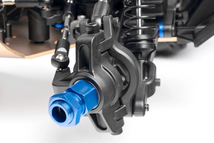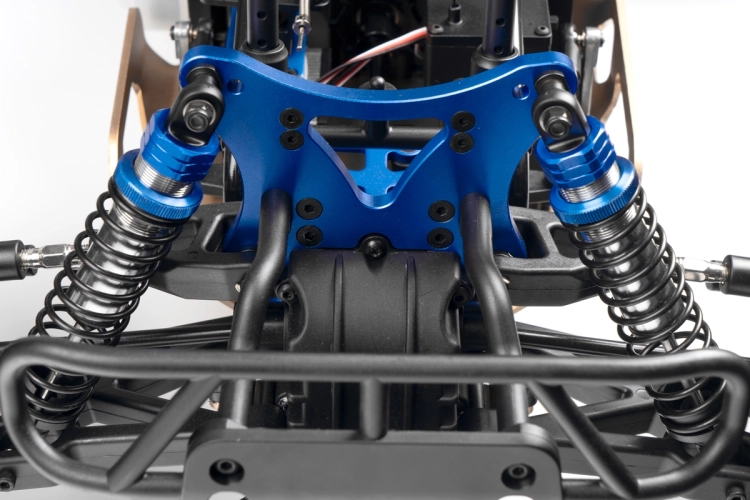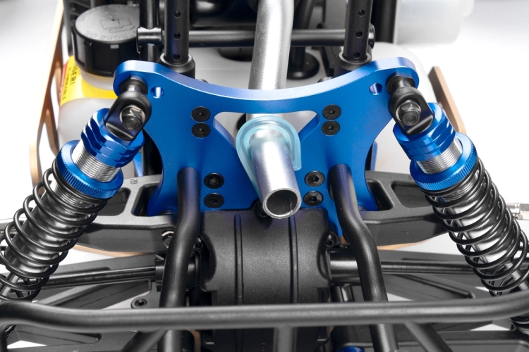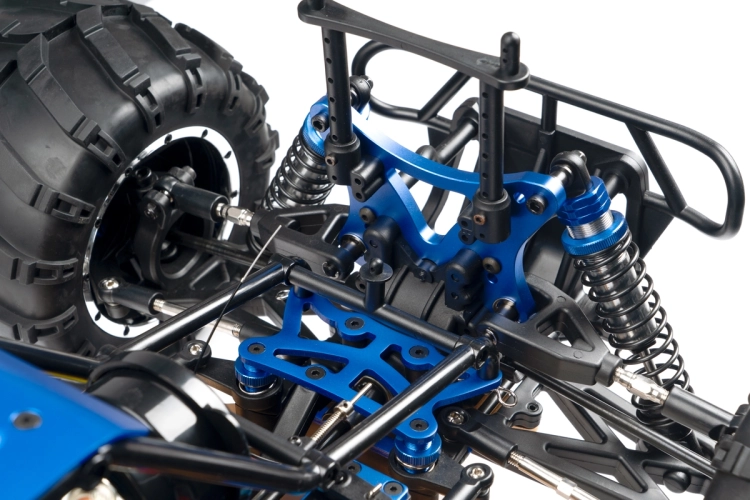 Veškeré spojovací tyče (svorníky ramen apod.) jsou ocelové o průměru 7mm vybavené pravo-levým závitem a šestihranem, což umožňuje pohodlné a přesné nastavení geometrie podvozku. O odpružení se stará čtveřice celokovových olejových tlumičů s vinutými pružinami. Předpětí pružiny je jednoduše nastavitelné pomocí matice s jemným závitem. Modře eloxované držáky tlumičů (parohy) jsou vyrobeny z 8mm silného!!! duralu. Ráfky kol jsou vybaveny šroubovaným límcem, který zajišťuje pneumatiku bez nutnosti lepení. Nízkoprofilové pneumatiky mají osvědčený "buggynový" vzorek a mají průměr 178mm. Bezpečně zastavit tento model to už chce sílu a proto je použita dvojitá kotoučová brzda.