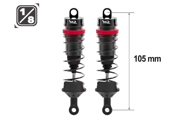 Celohliníkové olejové tlumiče pro modely 1/8 a podobné, Celková délka mezi čepy je 105mm, průměr pístku je 16mm. Sada obsahuje: tři páry pružin: měkké, střední a tvrdé; horní i spodní upevňovací materiál.