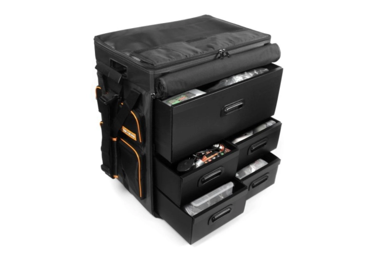 Horní polička na zip je vybavena držáky na nářadí, ale vejde se do ní snadno i organizér na nářadí. Je zde spousta dalšího prostoru pro velké nářadí, velký ručník do depa a mnoho dalšího! Výběr bočních kapes zahrnuje obrovskou boční kapsu, do které se vejde mimořádně velká nastavovací deska, koncovou kapsu na návody k použití nebo časopisy a dvě kapsy na opačném konci, do kterých se vejdou čisticí spreje a oleje na diferenciály nebo tlumiče.
