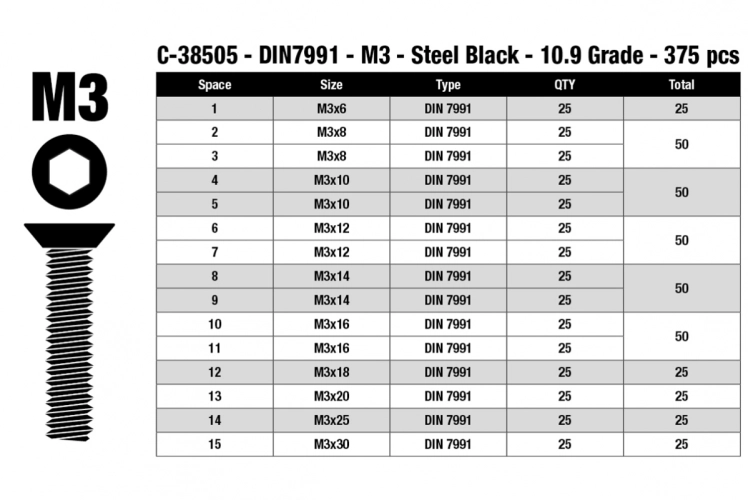 Imbus šrouby s zápustnou hlavou - sada/box - M3 - ocelové černé, 375 ks.