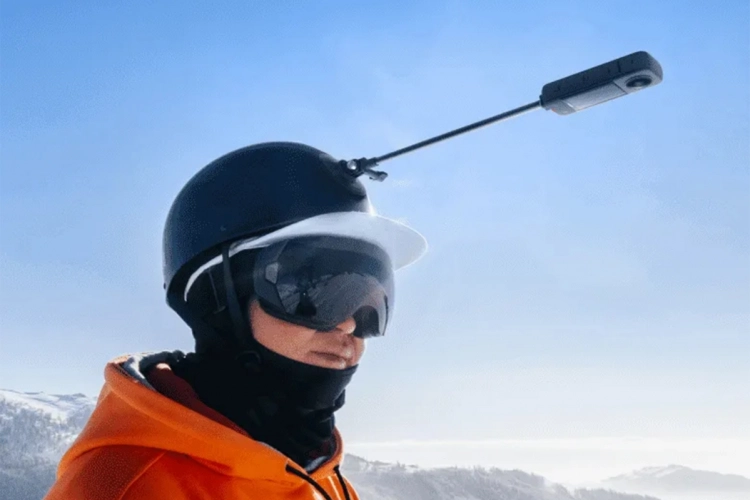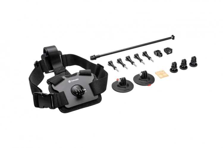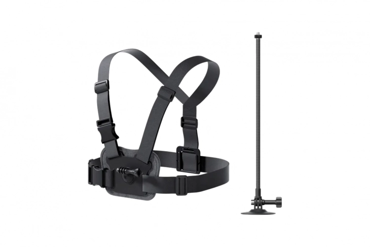 Balíček příslušenství pro akční kamery, který je určený pro použití při zimních sportech. Balení obsahuje hrudní popruh a montážní sadu na helmu včetně prodlužovací tyče.
