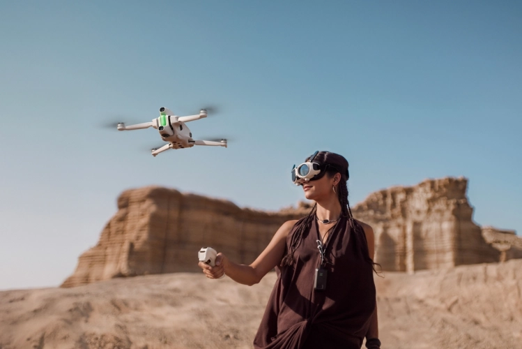Součástí balení jsou špičkové brýle s Micro-OLED displeji a extrémně širokým zorným polem (90°). Nabízejí 200" obraz přímo před očima s podporou HDR10+ a TÜV certifikací pro nízkou úroveň modrého světla. Díky nim se ocitnete přímo ve vzduchu – ať už letíte, nebo si přehráváte záznam.