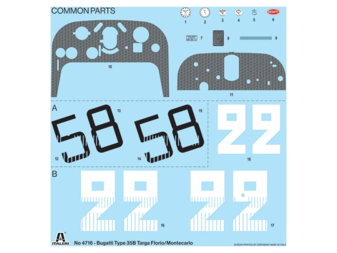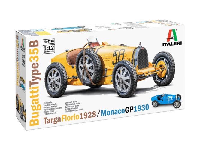 Italeri plastikový model auta Bugatti T35B Targa F./GP Monaco v měřítku 1:12 ke slepení. Délka 30,6 cm, stavební obtížnost 5.
