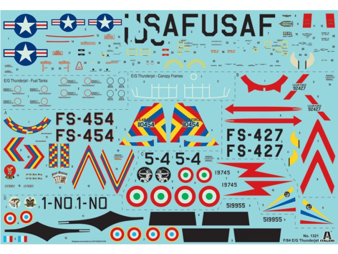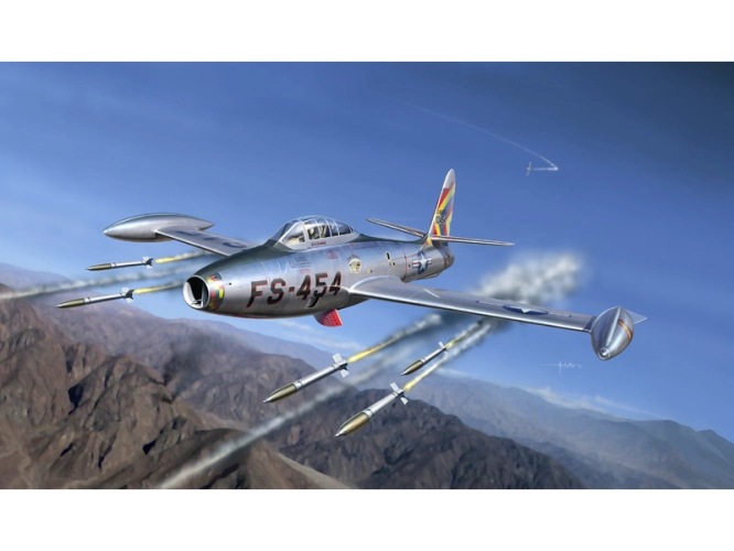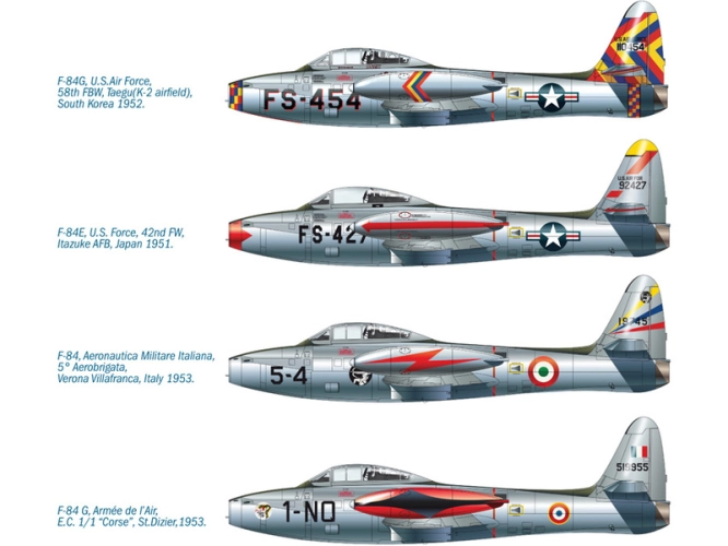 Letoun F-84 Thunderjet byl vyvinut bezprostředně po válce americkou společností Republic, která měla za cíl poskytnout americkému letectvu nový typ stíhacího bombardéru s proudovým pohonem. Jeho aerodynamická konstrukce byla jednoduchá, ale velmi účinná a robustní, s velkým kruhovým předním přívodem vzduchu, rovnými křídly a tříkolovým podvozkem s předním kolem. Díky motoru General Electric/Allison J35 mohl F-84 dosáhnout rychlosti až 1 000 km/h. F-84G, který se začal vyrábět v roce 1951, představuje jednu z finálních verzí stíhacího bombardéru společnosti Republic. Kromě USAF jej v rámci programu „Vzájemné obranné pomoci“ používalo i mnoho zemí NATO. Od roku 1952 jím bylo vybaveno několik stíhacích jednotek italského letectva. Byl vyzbrojen šesti 12,7mm kulomety a mohl nést útočný náklad o hmotnosti téměř 900 kg.