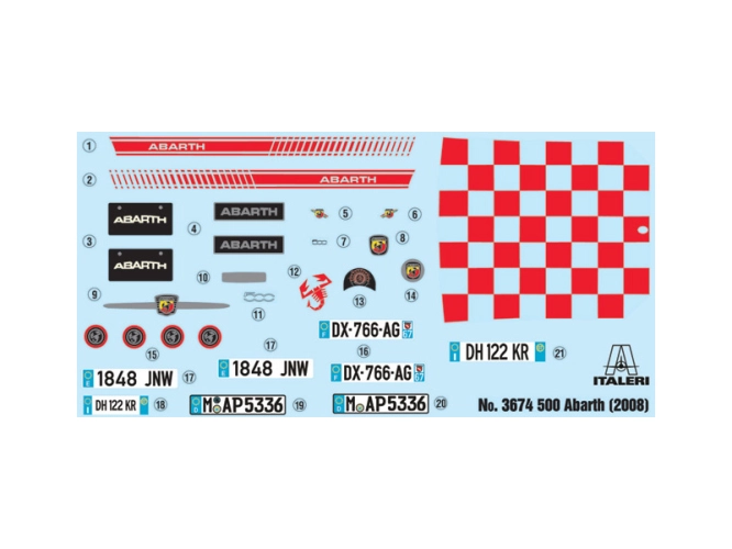 Italeri plastikový model auta Fiat 500 Abarth (2008) v měřítku 1:24 ke slepení. Délka 15,2 cm, stavební obtížnost 3.