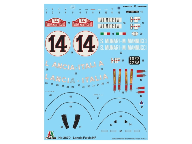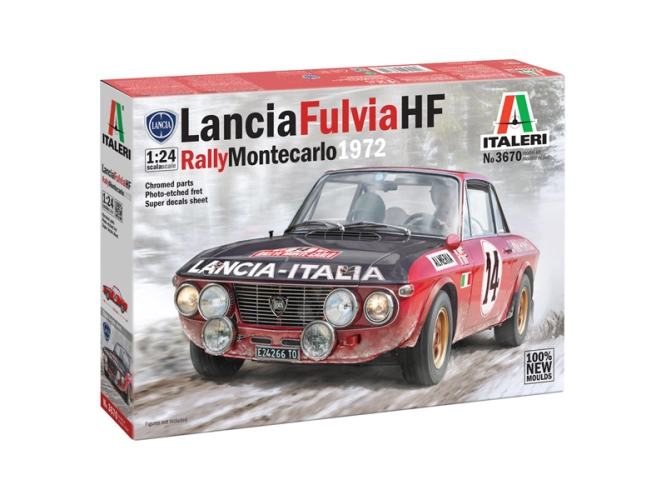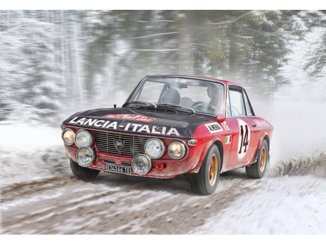 Italeri plastikový model auta Lancia Fulvia HF v měřítku 1:24 ke slepení. Délka 16,6 cm, stavební obtížnost 4.
