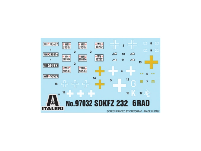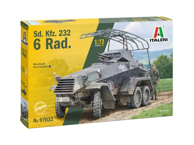 Italeri plastikový model obrněného auta Sd.Kfz. 232. 6 Rad v měřítku 1:72 ke slepení. Délka 8,5 cm, stavební obtížnost 2.