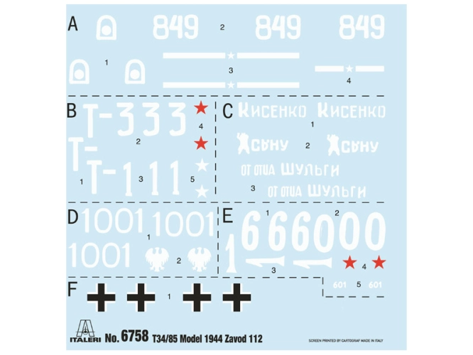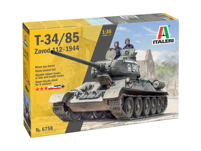 Italeri plastikový model tanku T34/85 Zavod 112 Mod. 1944 v měřítku 1:35 ke slepení. Délka 23,3 cm, stavební obtížnost 4.