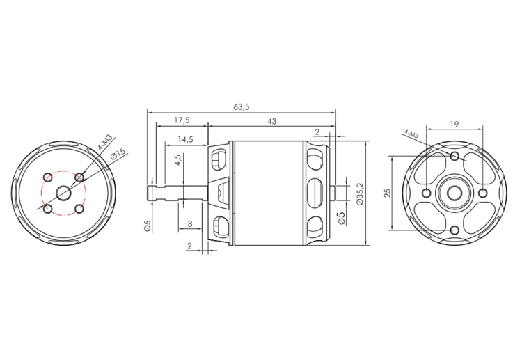 Montáž motoru: KAVAN PRO 3542-950 je konstruován pro přední i zadní montáž. Při přední montáži za čelo motoru použijte čtyři šrouby M3, které zasahují do čela motoru v rozmezí 3,5-4 mm. Motorová přepážka by měla být ze 4-5 mm letecké překližky. Sada pro zadní montáž (upevňovací kříž, unašeč vrtule pro zadní montáž) je dodávána spolu s motorem.