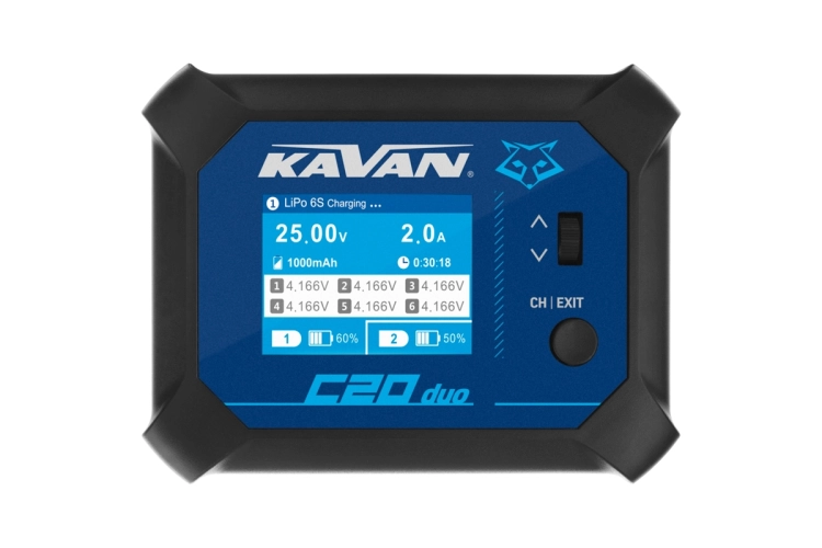 Malý dvoukanálový nabíječ KAVAN C20 Duo je inteligentní nabíječ s napájením ze sítě i autobaterie a velmi jednoduchou a přehlednou obsluhou. KAVAN C20 Duo umožňuje nabíjet běžné typy článků (NiCd, NiMH, LiPo, LiHV, ULiHV, Li-ion, LiFe, Pb), navíc je vybaven vestavěnými šestikanálovými balancery, které zajišťují bezpečné nabíjení lithiových akumulátorů. Nabíječ je vybaven barevným LCD displejem a programovacím kolečkem a tlačítkem, které vám poskytnou možnost komfortního a velice přehledného nastavování parametrů, řízení a sledování průběhu nabíjení.