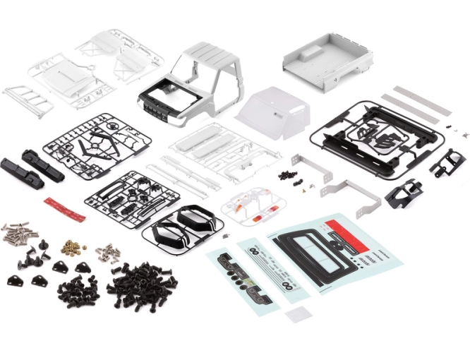 Balení s karosérii Toyota Land Cruiser 70 obsahuje tyto součásti: kabinu, nákladový prostor, chromované díly, světlomety, přední nárazník, vstupy vzduchu, zrcátka, lexanové zasklení kabiny, volant, stěrač, potřebné příslušenství k sestavení, archy samolepek – na karosérii, přístrojovou desku, obrázkový návod…