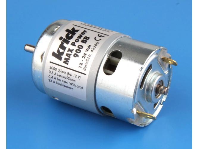 Krick Motor MAX Power 900 BB je stejnosměrný univerzální elektromotor řady 900 s vysokým točivým momentem, nízkou rychlostí, kuličkovými ložisky a vnitřním ventilátorem. Celkový rozměr ø50 x 101 mm, rozměr pouzdra ø48 x 72 mm, hřídel ø 5 mm, jmenovité napájecí napětí 12 V, proud do 24 A, hmotnost 495 g. Statorový kroužek pro větší krouticí moment. Otáčky na prázdno: 3000 ot./min při 12V (0,5A).