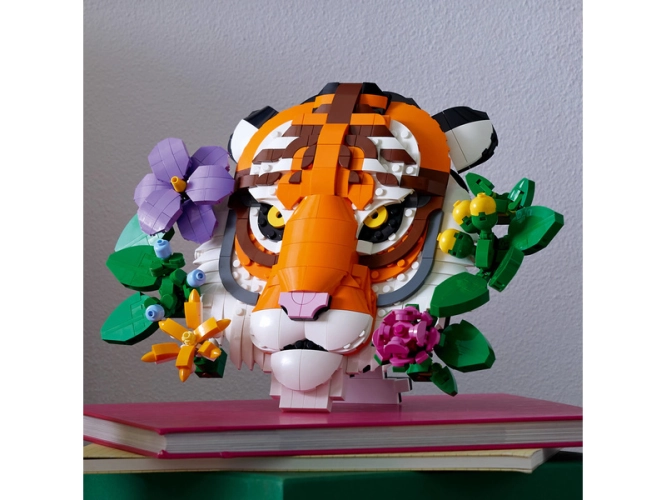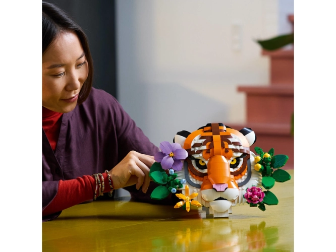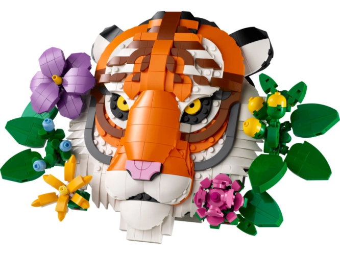 - Dekorace s tygrem a květinami – Dodejte svému domovu trochu barev a přírody se stavebnicí LEGO® Art (31217) Kolekce zvířat – Tygr