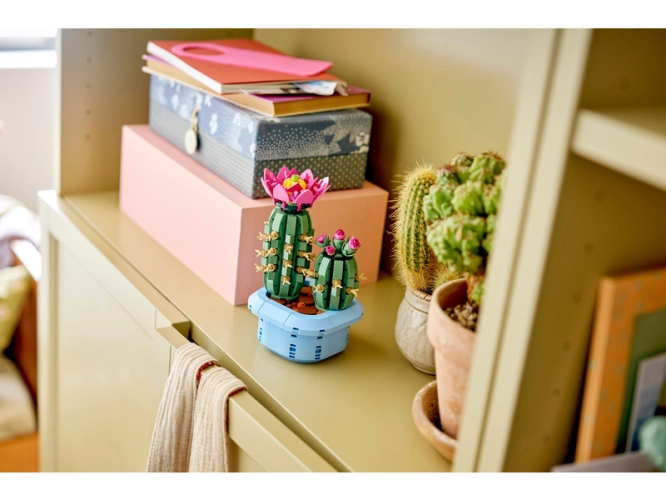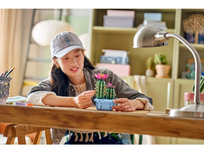 Větší kaktus LEGO má plně rozkvetlý růžový květ se žlutým středem a menší kaktus LEGO má růžová poupata v různých fázích růstu. Kaktusy mají autentický odstín zelené barvy a jsou zasazeny do pastelově modrého květináče, aby si je děti mohly po sestavení snadno vystavit jako dekoraci v pokojíčku nebo domova.